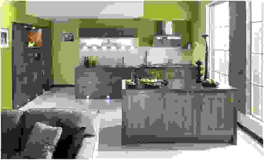 Грамотное зонирование: фисташковая стена подчёркивает обеденную зону, а серая отделка визуально ограничивает зону кухни