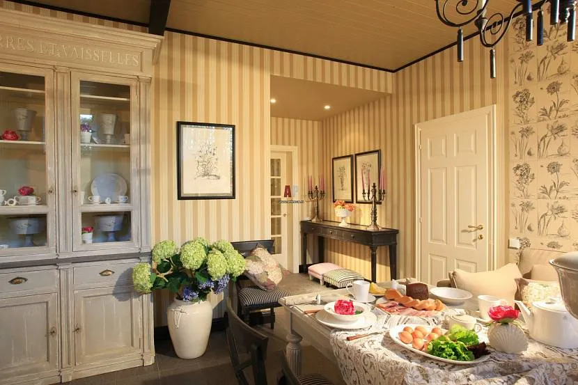 Традиционность геометрического дизайна ценится и в таких деревенских стилях, как кантри и прованс, поэтому в этих интерьерах привычна клетка более спокойных, пастельных оттенков. Особым штрихом прованса является использование полоски, как в мебельной обивке, так и в отделке стен.