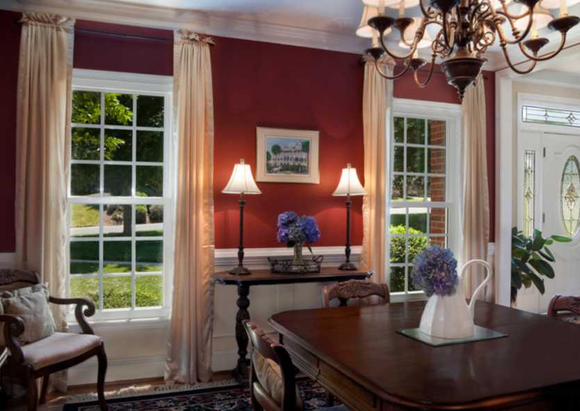 Именно в гостиной, часто встречается два окна, они придают оригинальность и красоту комнате. Уместен любой вариант: классический, французский, австрийский. Идеальным решением для гостиной будут портьеры в пол с ламбрекеном, но не жёстким. Обязательное условие – идентичность.