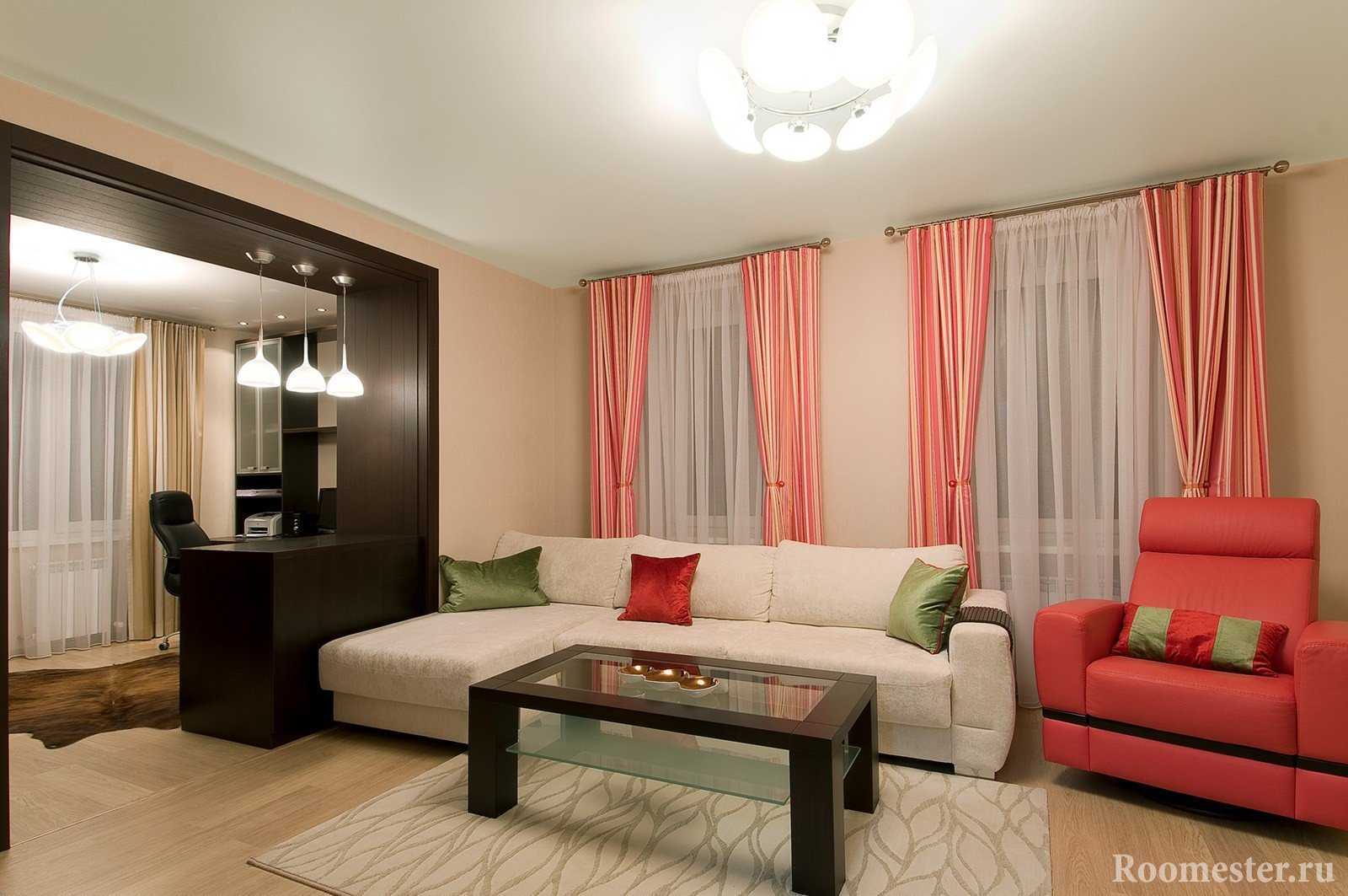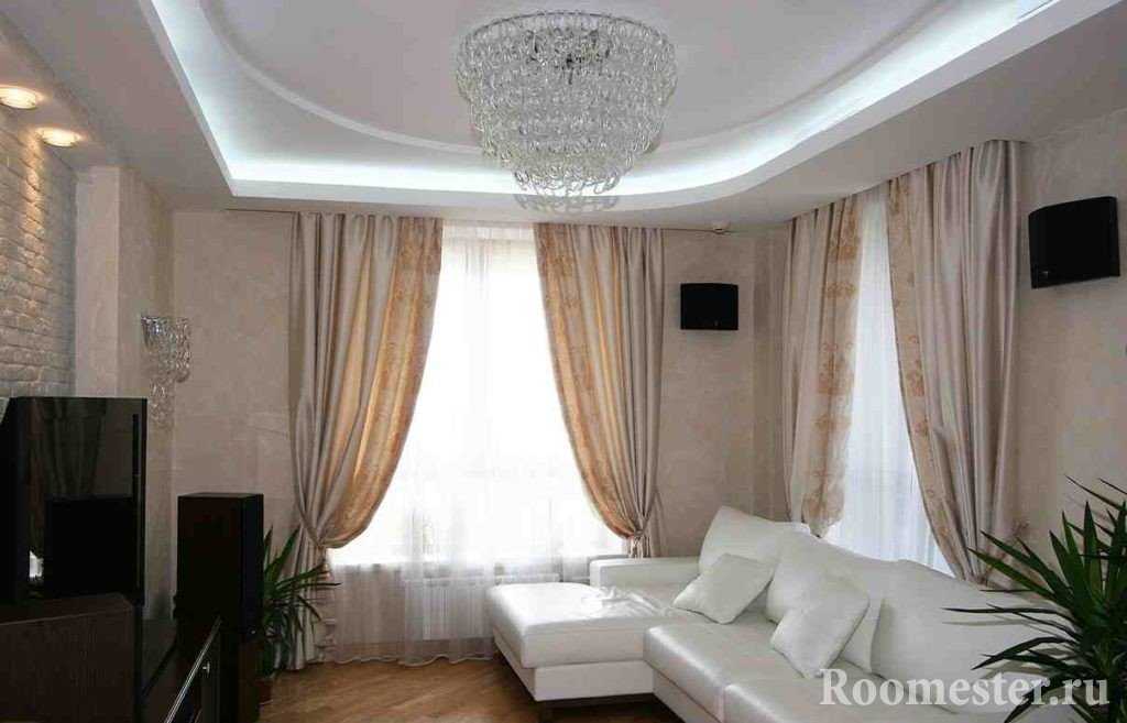Большие совмещенные комнаты с хорошей вытяжкой можно украсить по всем стандартам гостиной. Можно установить многоуровневый карниз, повесить красивые занавески с многослойной драпировкой, сверху дополнить композицию ламбрекенами, использовать одну общую занавеску. Если целостный дизайн не предусмотрен, необходимо выполнить зонирование помещения, каждый проем можно оформить разными видами текстиля.