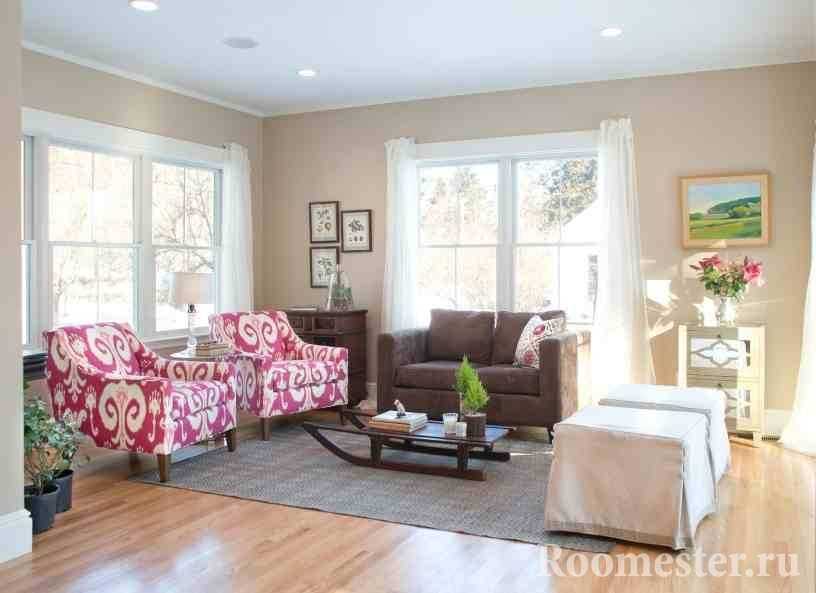 Около окон должна находиться гостиная зона – кресла, журнальный столик, этажерки. Вариантов такого решения может быть несколько: