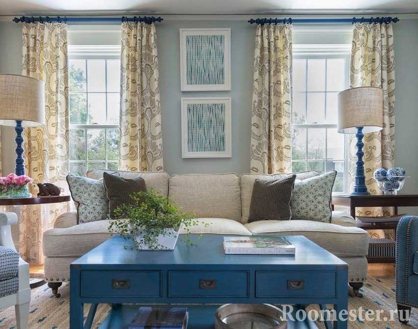В этом варианте планировки основное действие внутри гостиной разворачивается вдали от оконных конструкций, несущих ограниченную осветительную функцию и роль некоего театрального занавеса, скрывающего вид за окном. Сборчатые французские маркизы, а также сдержанные английские аналоги – это всего лишь обрамление, а не центр комнатной композиции.
