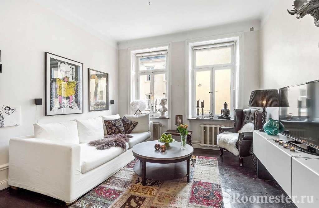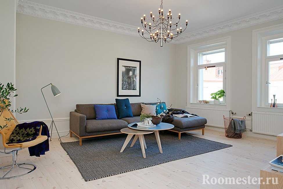 Гостиная, где оконные проемы расположены симметрично на одной стене напротив двери, предлагает в качестве основной идеи дизайнерского решения использовать симметрию. Любой стиль, опирающийся на симметричные детали и конструкции, здесь будет уместен.