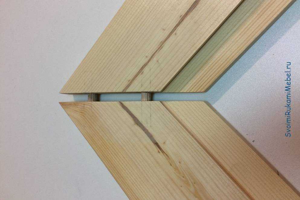 - Спилить торцевые части элементов под углом 45 градусов, а затем соединить между собой посредством уголков, саморезов и клея.