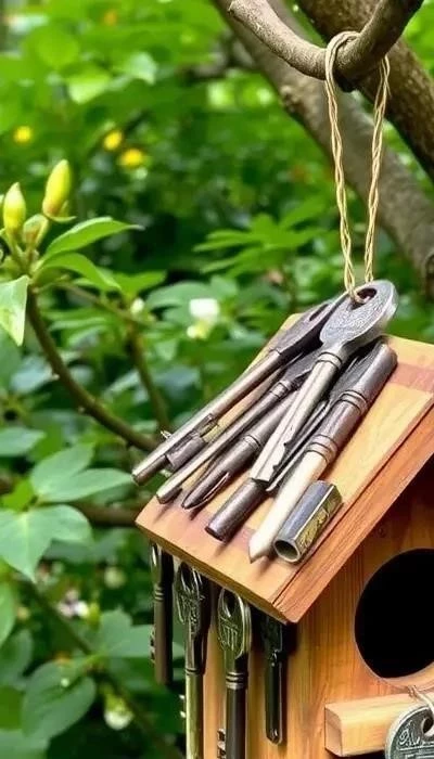 Создайте подвесные украшения из ключей, которые можно повесить на деревья, кусты или забор. Ключи можно соединить проволокой или леской.