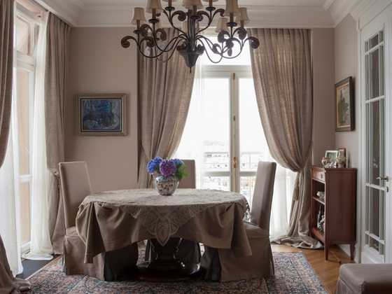 Шторы, к примеру, должны быть немного задрапированы, а по длине доходить до пола, но не лежать на нем