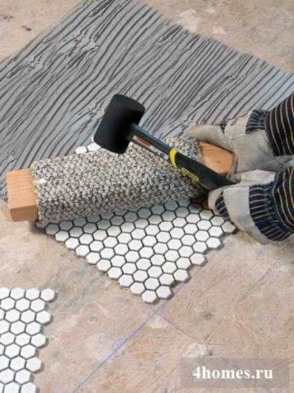 Приложите один уголок листа в угол ячейки с клеем на полу. Выровняйте стороны листа с линиями ячейки. Прижмите лист к клею. Для надежности сцепления приложите к листу доску, обернутую тканью, и постучите по ней резиновым молотком. Следите за тем, чтобы лист ложился на клей без появления впадин – неровности очень сильно видны на мозаике.