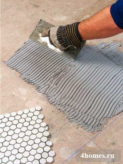 Шаг 1. Прежде всего, нанесите на предварительно подготовленный пол клей, распределяя его зубчатым шпателем. Цементный клей наносите под 1 ряд, а при нанесении эпоксидного смотрите на указанные изготовителем сроки застывания. Нужно, чтобы получился слой не более 0,5 см.