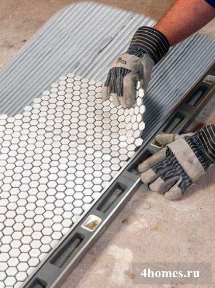 Шаг 3. Немного прижмите кельмой плитку, утапливая сетку в клее. В обязательном порядке проверяйте все строительным уровнем.