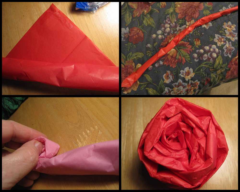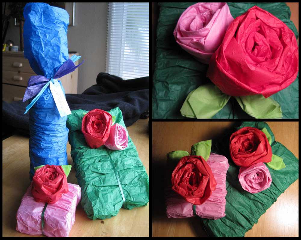 Чтобы упаковка не выглядела пресно – украсьте ее поделками из этой же папиросной бумаги, например, розами: