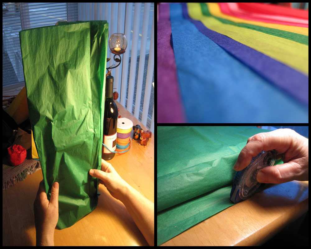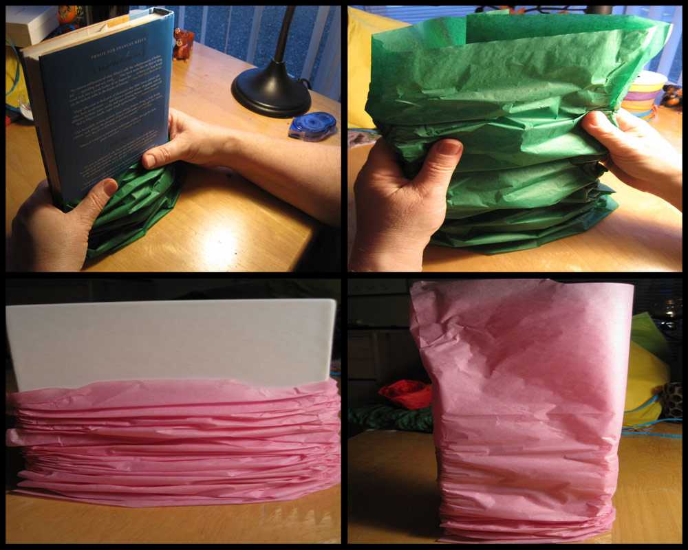 | Проделайте три яруса в центре бумаги. Их удобно зафиксировать скотчем или лентой, но на обратной стороне. |