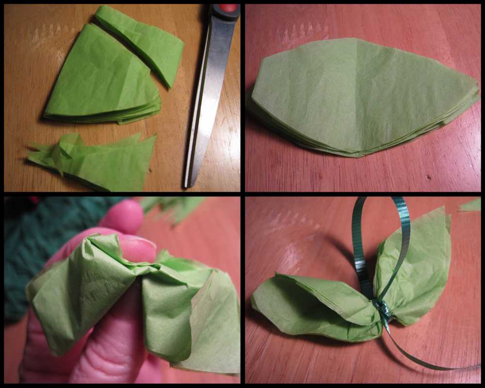 - Согните папиросную бумагу пополам, вырежьте цветы, как показано на фото, получится «восьмерочка». Пальцами сожмите центр этих листиков, перевяжите ленточкой.