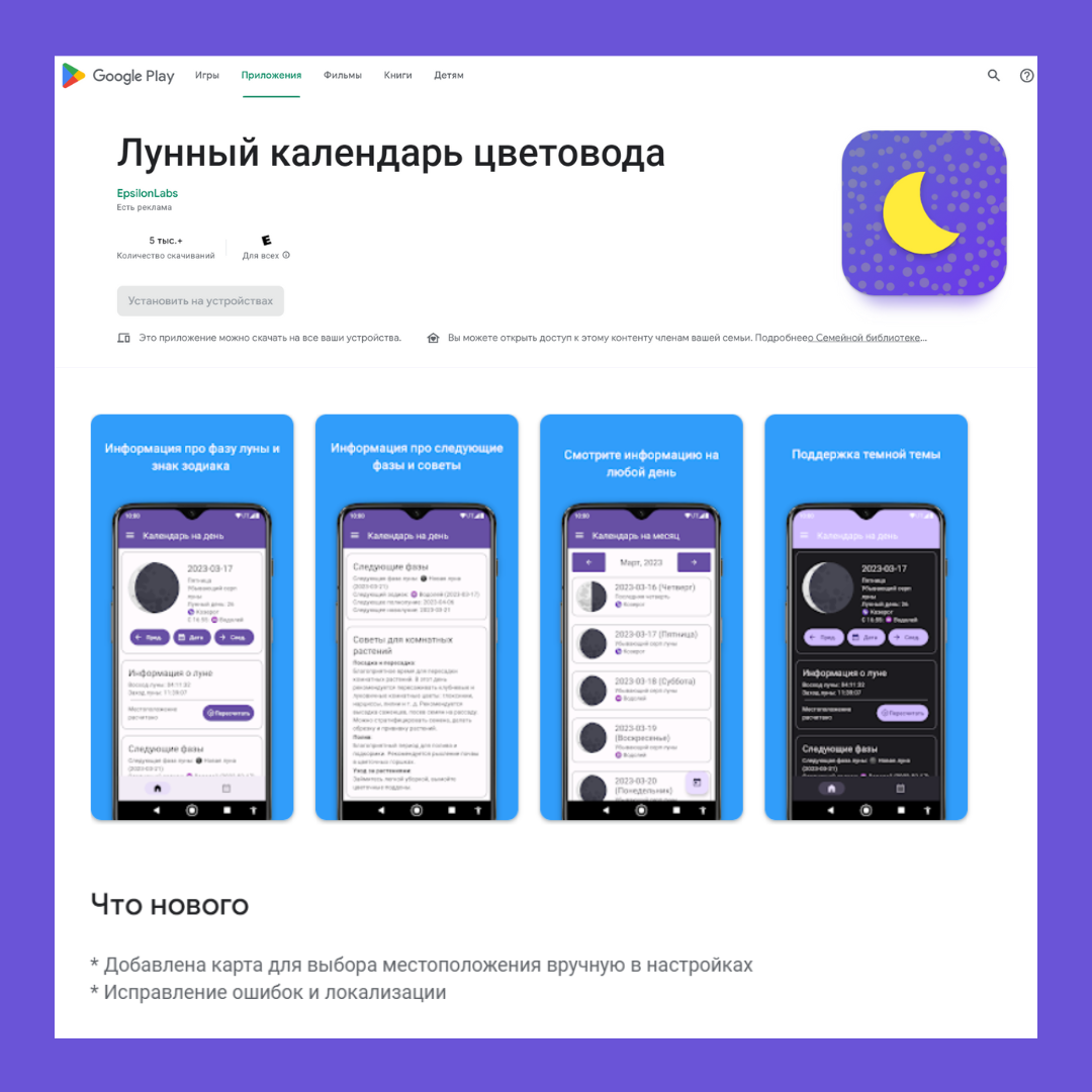 Хотите иметь всегда под рукой удобный лунный календарь, в котором указаны благоприятные и неблагоприятные даты для посадки и пересадки комнатных цветов, полива и удобрения растений, обработки от вредителей? Представляем вашему вниманию приложение Лунный календарь комнатных растений, которое можно совершенно бесплатно СКАЧАТЬ в Play market по ССЫЛКЕ.