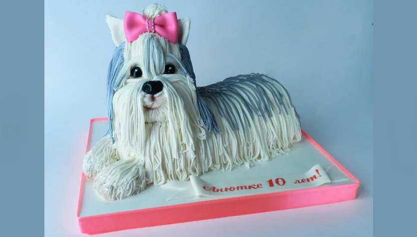 Можно сделать и другой торт-собачку из мастики. Испеките коржи и соберите туловище и мордочку аналогично мишке, как было описано выше. Затем из мастики сделайте тонкую «лапшу» и украсьте торт, чтобы получилась собака.