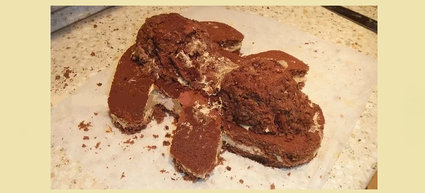 - Из одного коржа и остатков испеченного бисквита сделайте крошку и соедините ее с кремом. Слепите лапки собаке, мордочку и верх спинки.