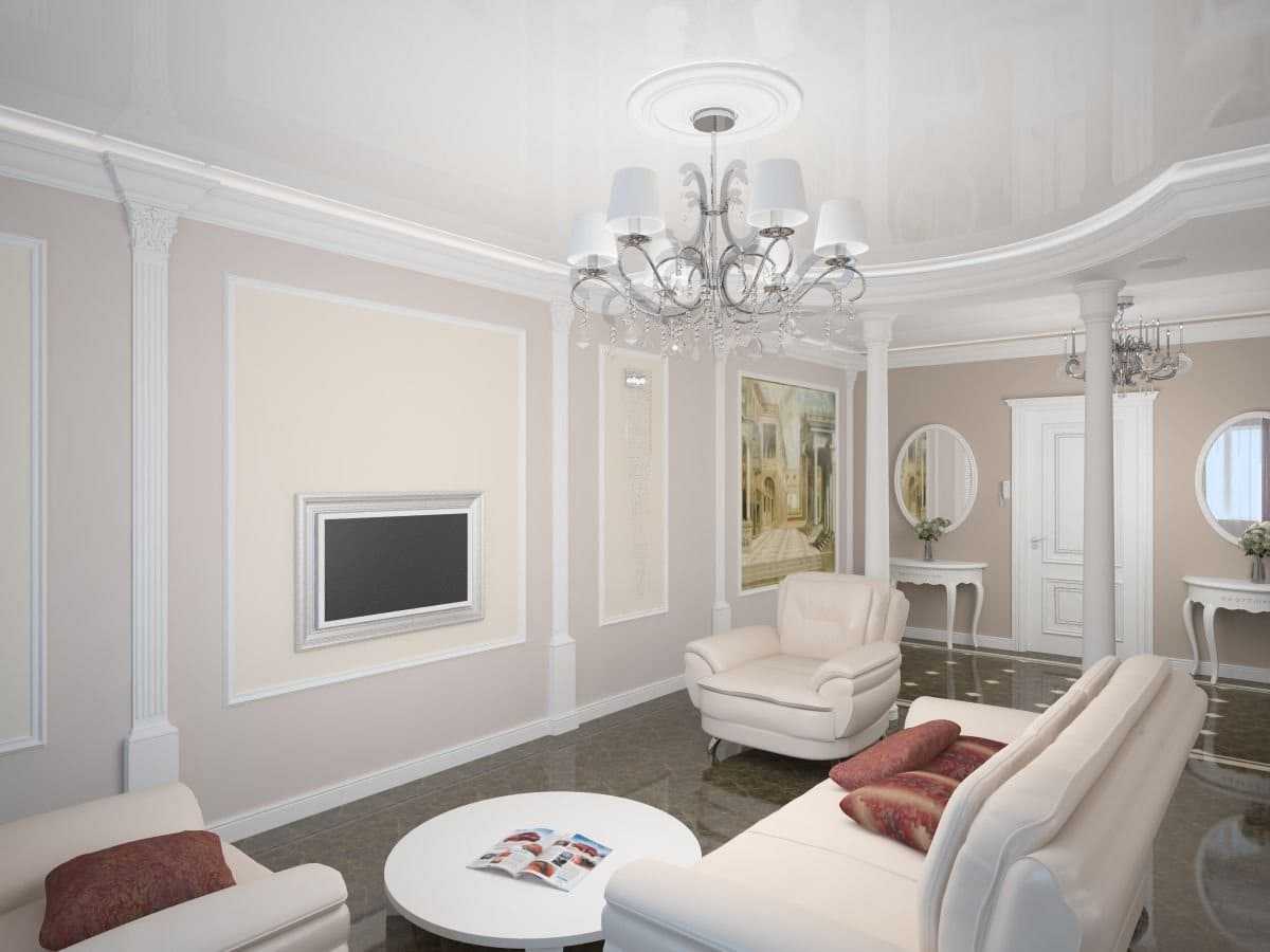 Основное требование неоклассицизма – простор и высокие потолки. Комната не нуждается в перегородках или делениях на зоны. Для этого используются колонны и мебель. Применяют массивную люстру из хрусталя, дорогой паркет, а потолки обязательно расписные.