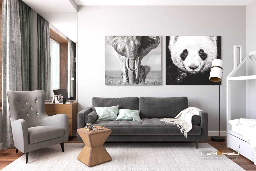 Черные цвета корпусной и мягкой мебели будут гармонично сочетаться с напольным покрытием и темными дверями. Бежевые же оттенки в сочетании с серыми придадут интерьеру глубины.