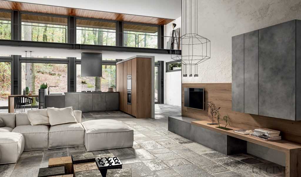 Сочетает в себе кухню и зону отдыха. Пока один человек готовит, второй может сидеть рядом на диване и читать книгу или смотреть телевизор. Основным цветом выступает белый, но иногда его меняют на черный, оливковый или золото.