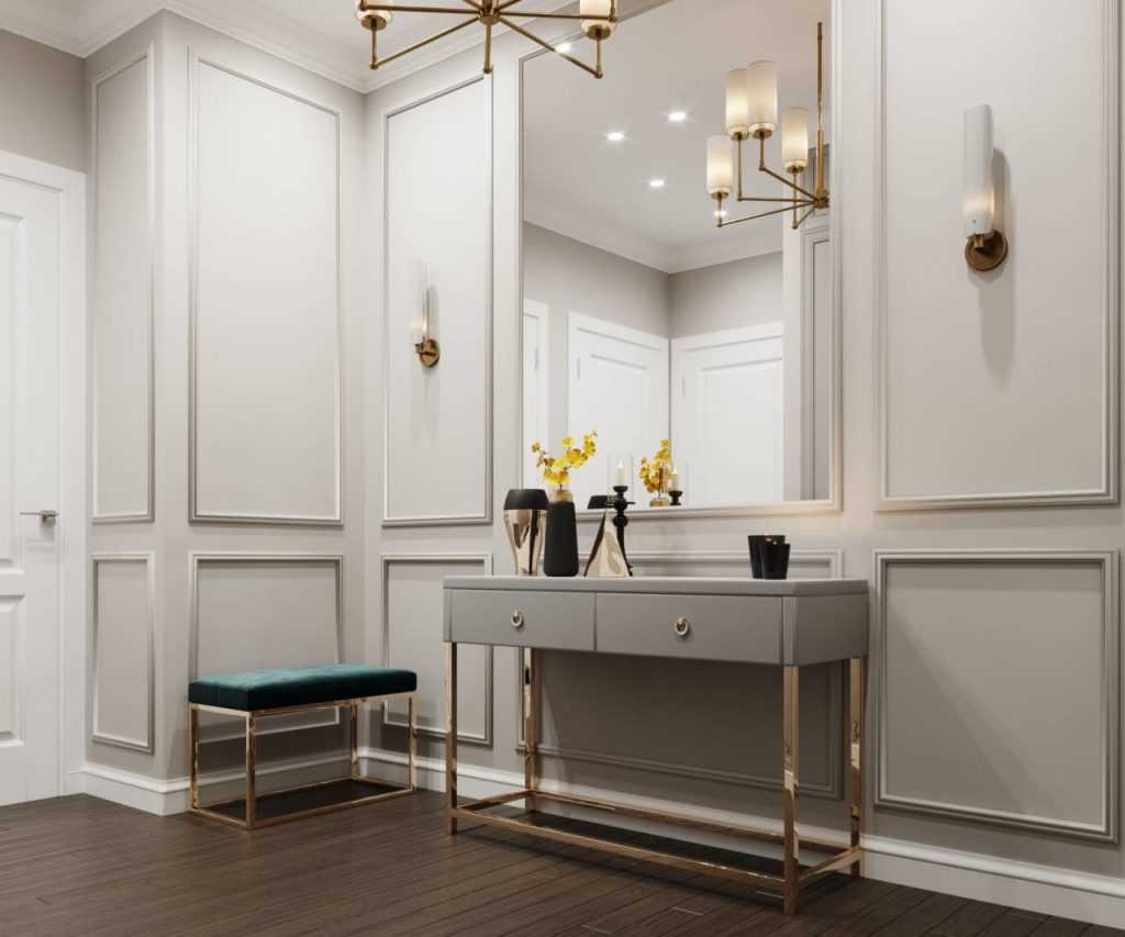 Оформление прихожей в стиле неоклассика зависит от ее параметров. Если она плавно переходит в гостиную, в отделке отталкиваются от дизайна комнаты – фотопримеры можно увидеть в нашей галерее. Если прихожая продолжена коридором, следует остановиться на неброском наполнении.