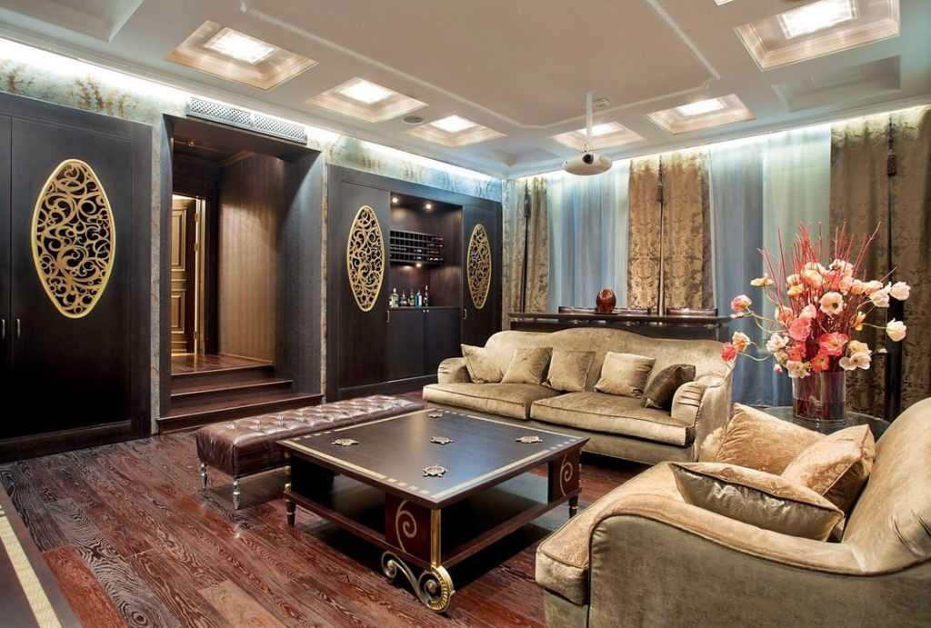 Гостиная превращается в средоточие дома, она становится связующим элементом декора с остальными комнатами. Белые натяжные потолки вкупе с темным блестящим паркетом, широкий плинтус с витиеватым узором, ниспадающие складками тяжелые шторы – обязательные атрибуты интерьера.