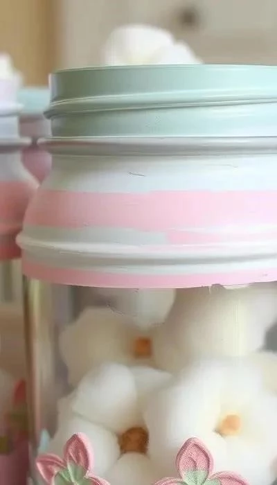 Описание: Банки можно использовать для хранения ватных дисков, палочек и других мелочей в ванной комнате. Материалы: банки, краски, кисти, декоративные элементы.