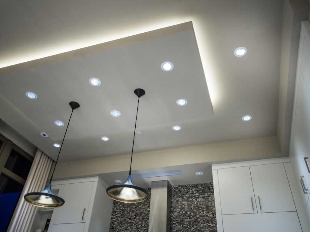 При монтаже двухуровневого потолка стоит обращать внимание на расположение светильников. По центру лучше всего размещать люстру, а точечные светильники или светодиодные ленты по нижнему ярусу. Варианты дизайна многоуровневых гипсокартонных потолков в интерьере кухни можно видеть на фото ниже