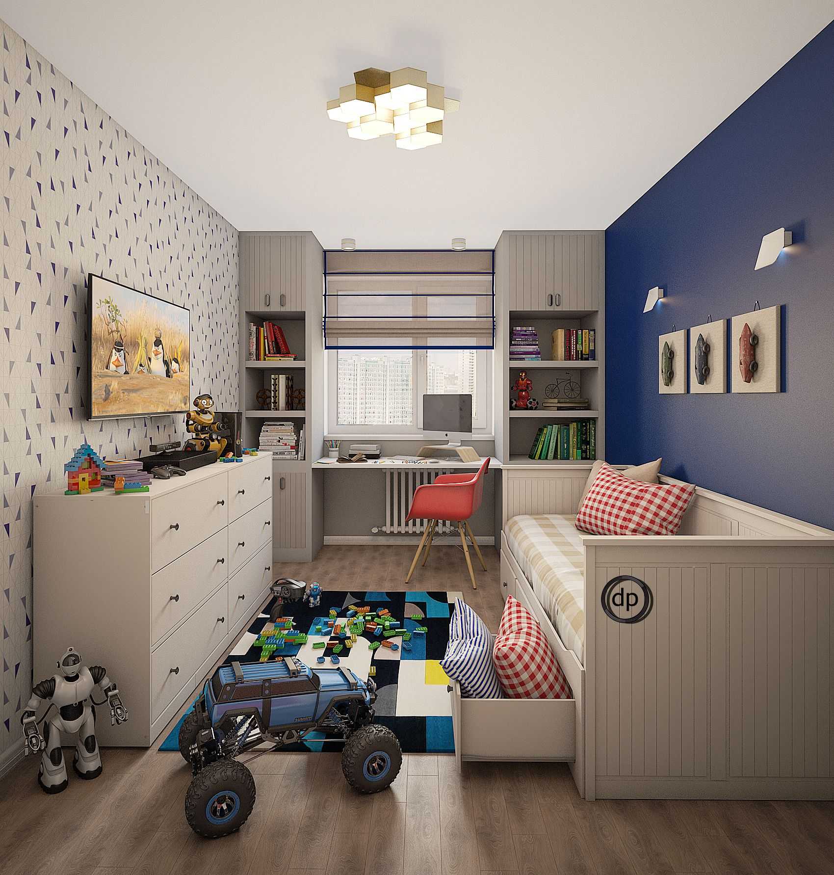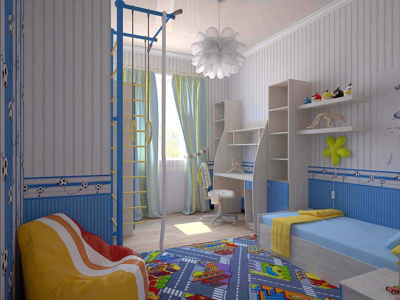 Часто в этой комнате прибегают к зонированию, выделяя участки для разных видов деятельности малыша. В зоне сна приклеиваются обои спокойных оттенков, например, светло-голубого, бежевого, нежно-желтого.