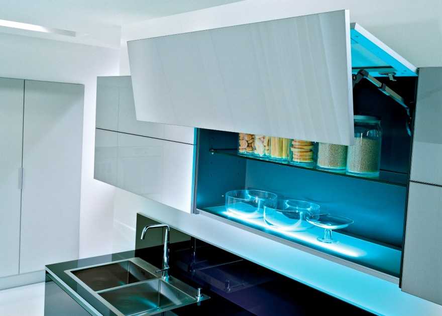 - Подсветка внутри прозрачных кухонных шкафчиков на любителя.
