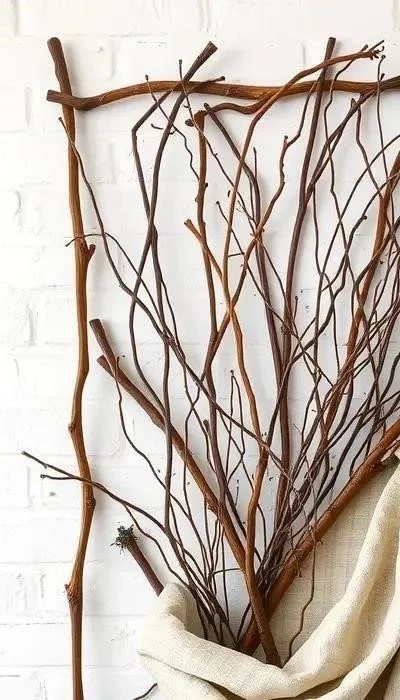 Материалы: Ветки, ткань, клей, основа для панно. Инструкция: 1. Обтяните основу тканью. 2. Приклейте ветки к ткани, создавая объемную композицию. 3. Дайте клею высохнуть.