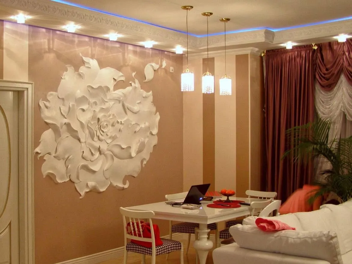 | Ручной | Это самые дорогие, дизайнерские изделия. Чтобы их изготовить мастер наносит через трафарет специальную массу на флизелиновую или виниловую основу. Чаще всего, для рельефа применяют особый вид декоративной штукатурки. Толщина слоя не превышает 2-х мм. Выпускаются эксклюзивные изделия под заказ по индивидуальным параметрам. | Изделия обладают гибкостью, пластичностью и эластичностью, то есть даже при скручивании панно в рулоны ни один из элементов не будет поврежден. |