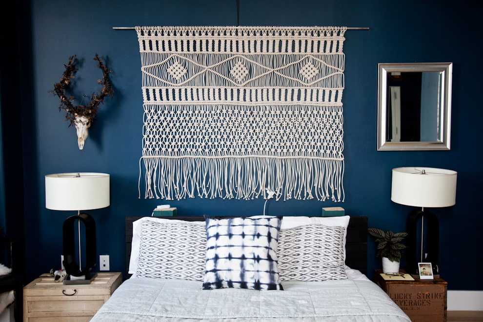 Очаровательные вязаные изделия на стене, добавляют дизайну комнаты теплоты и гармонии.