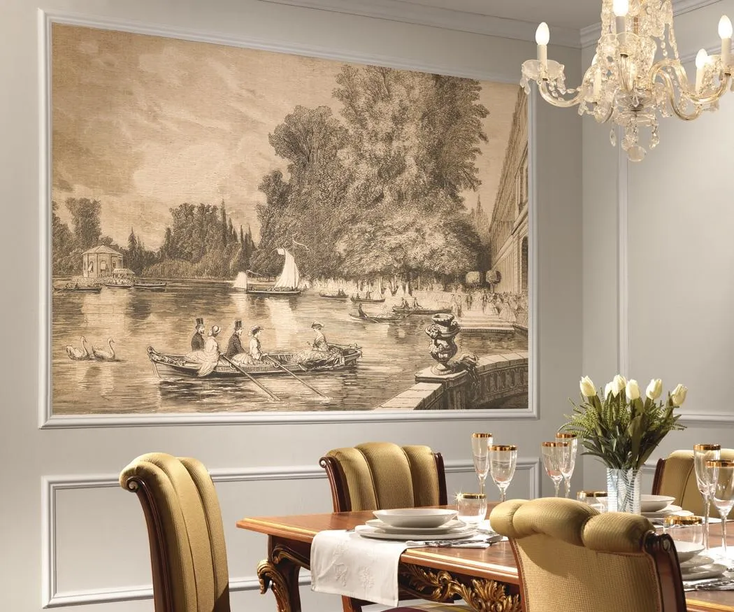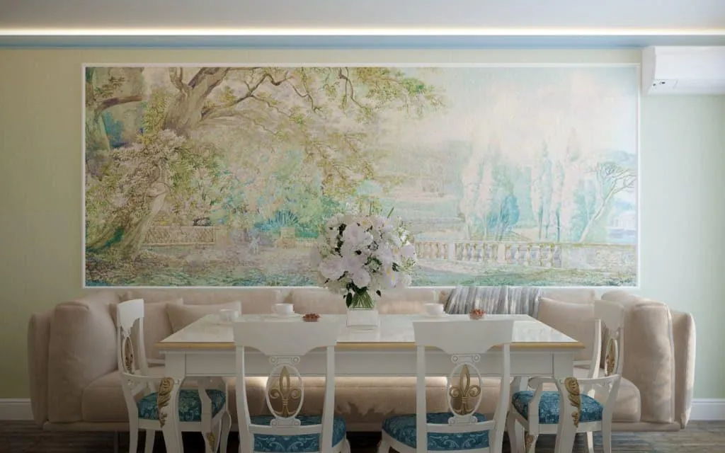 Задача изделия, предназначенного для размещения над обеденным столом, зрительно выделить столовую зону. В этом случае обычно применяют панно на гастрономическую тематику, пасторальные пейзажи, цветочные композиции, абстрактные изображения.