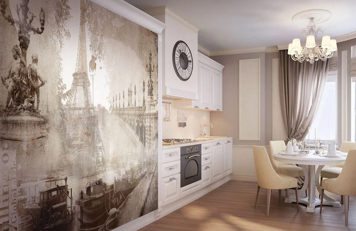 Настенный декор располагают таким образом, чтобы привлечь внимание к определённым участкам помещения, а также разделить кухню на функциональные зоны: рабочую, обеденную
