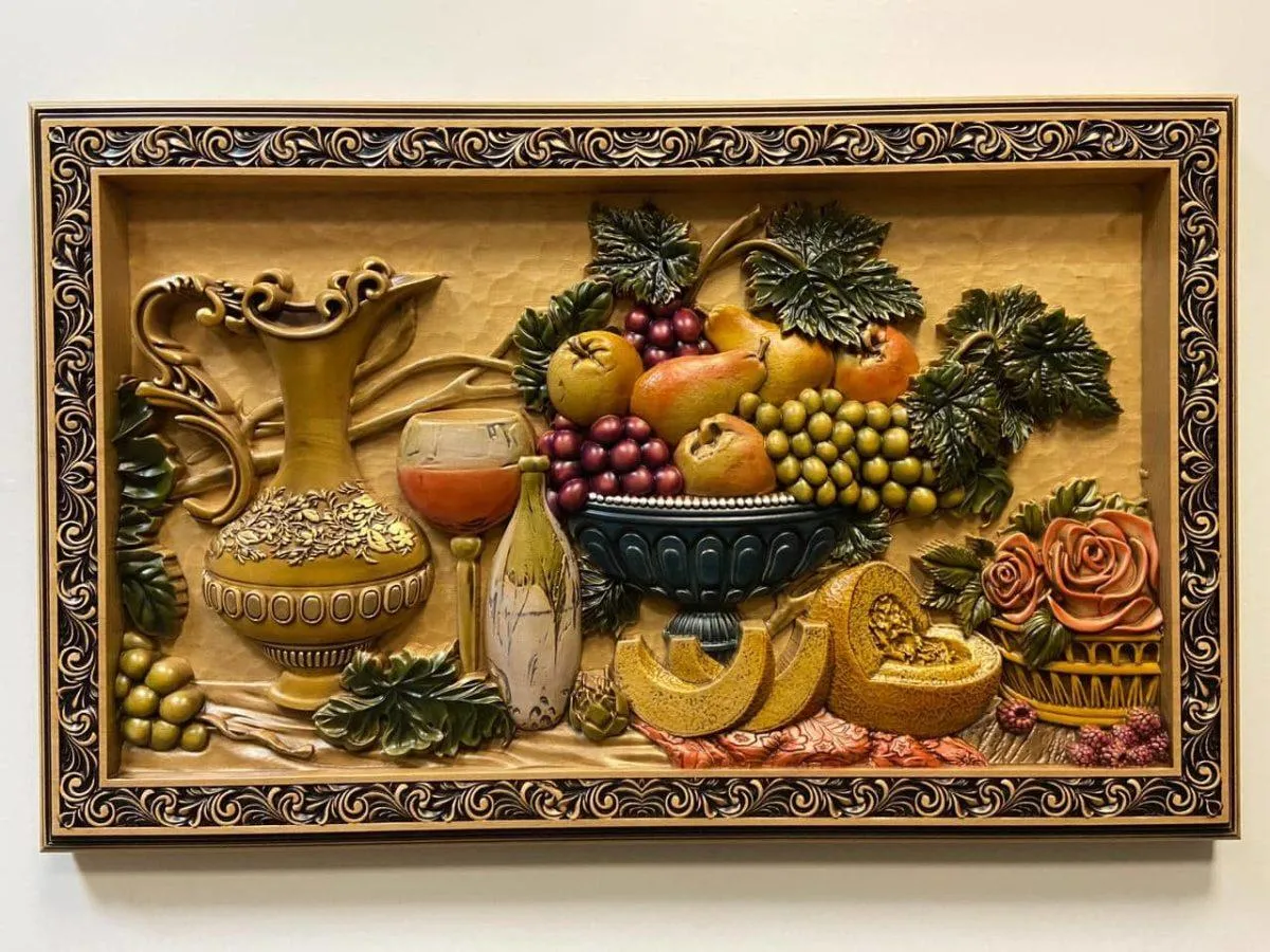 Панно на плодово–ягодную тему в плоском или объёмном исполнении способно радовать круглый год. В его оформлении также могут присутствовать засушенные растения (цветы, листья, колоски).