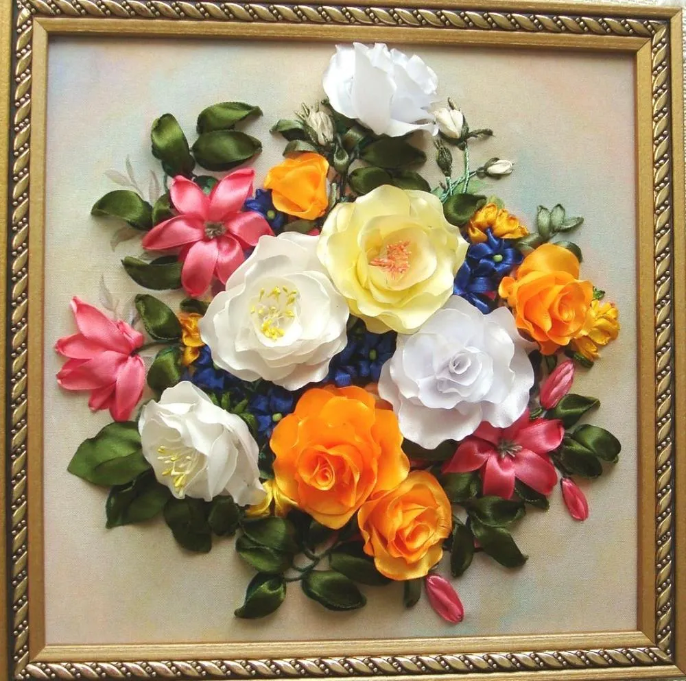 Техника «канзаши» позволяет создавать объёмные картины из атласных лент. Обычно они изображают цветочные букеты.