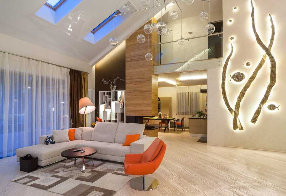 При желании под панно можно отдать всю поверхность стены. Такой подход разумно использовать в просторном помещении, чтобы все детали были на виду и не перекрывались предметами мебели.
