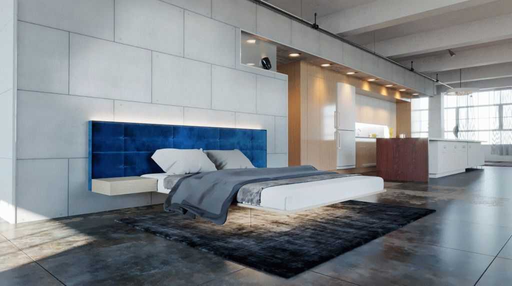 Фото парящей кровати Нередко парящая кровать дополняется расширенным и усиленным изголовьем, которое можно дополнить полками, тумбой под торшер или ноутбук – это расширяет функционал мебели и вместе с тем добавляет ей устойчивости
