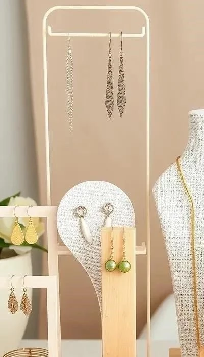 - Сочетание с интерьером: Выбирайте цвета и материалы, которые гармонируют с общим стилем вашего магазина или комнаты. Например, для магазина в стиле лофт подойдут подставки из металла и необработанного дерева, а для бутика с нежными украшениями – тканевые или гипсовые в пастельных тонах. Пробковые доски, обтянутые тканью и украшенные лентами, станут функциональным и стильным элементом декора, легко адаптируемым под любые изменения.