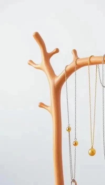 Деревянные подставки – это классика, всегда в моде. Они прочны, долговечны, легко декорируются. Используйте цельные бруски или красивые ветки, превращая их в арт-объект. Для подставки-дерева можно взять два модуля (ажурные или простые): вырезать, отшлифовать, соединить, покрыть лаком/краской. Простой вариант: устойчивая деревянная основа с обработанной веткой. На ветках удобно развешивать бусы, браслеты, а в небольшие отверстия вставлять серьги. Покрасьте дерево в нейтральный цвет или задекорируйте декупажем. Идея: используйте молодой побег акации (колючку), закрепив его в металлической корзинке для карандашей с бусинами, установленной в керамическую вазочку. Это создаст уникальный эко-стиль и станет изысканным акцентом.