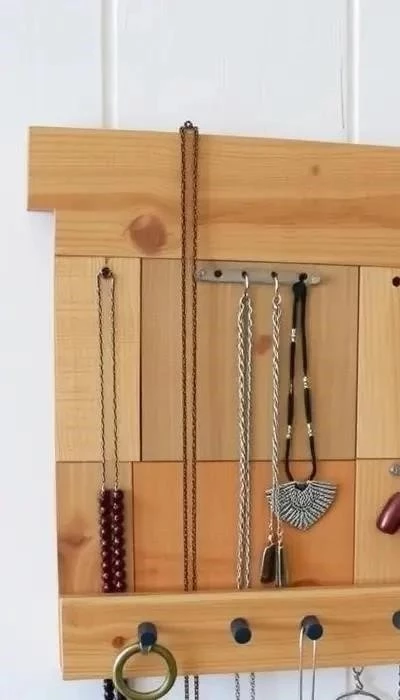 Материалы: деревянная доска, крючки, краска, лак. Инструменты: пила, дрель, кисть. Сложность: средняя. Стоимость: 300-500 рублей. Описание: Вырежьте из доски прямоугольник, просверлите отверстия для крючков, покрасьте и покройте лаком. Идеально подходит для хранения цепочек и браслетов.