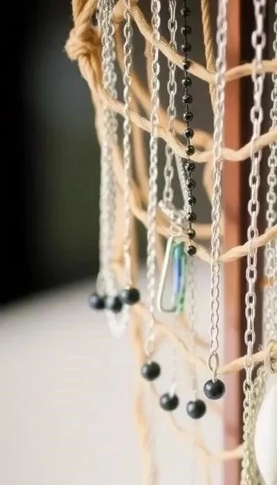 Подставка, выполненная в виде натянутой рыболовной сети, на которой закреплены крючки или небольшие кольца для подвешивания украшений. Можно использовать настоящую сеть или имитацию из веревки. Преимущества: аутентичность, оригинальность, легкость изготовления. Материалы: рыболовная сеть, деревянная рамка, крючки или кольца.