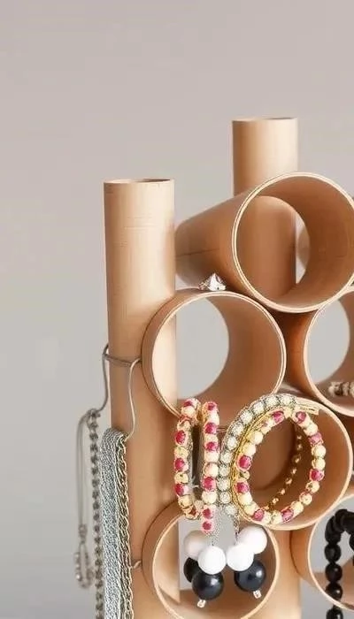 Описание: Обрежьте картонные втулки от туалетной бумаги или бумажных полотенец и склейте их вместе, чтобы создать ячейки для хранения украшений.