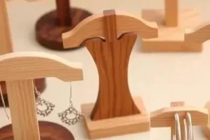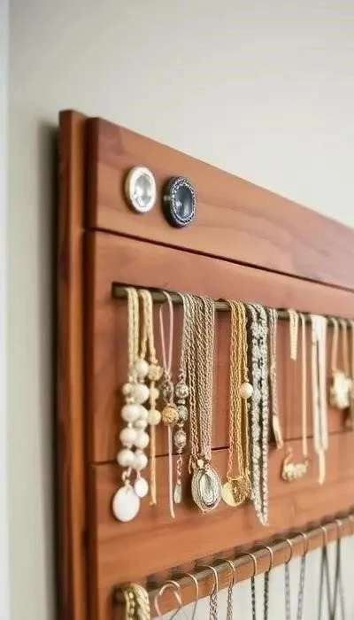 Описание: Вырежьте из дерева прямоугольную основу и прикрепите к ней крючки для цепочек и браслетов.