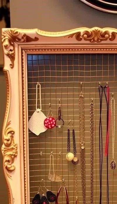 Описание: Прикрепите к задней стенке старой рамки сетку или ткань и используйте ее для подвешивания украшений. (Как упоминалось в информации из интернета)