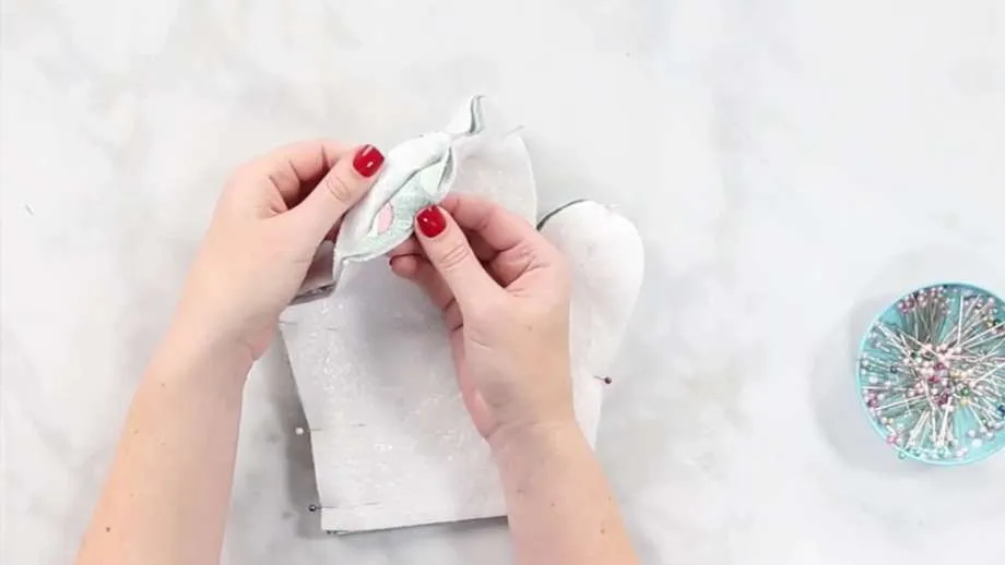 Выворачиваем внешнюю и внутреннюю часть варежки на изнаночную сторону. Стачиваем верхние срезы, совместив боковые швы.