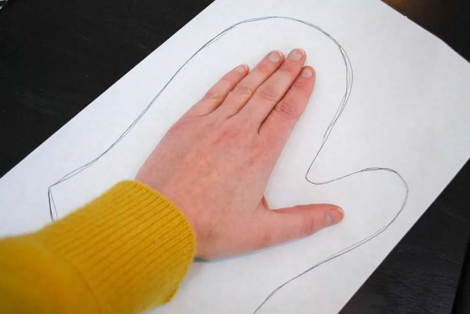 Для изготовления прихватки-варежки потребуется 6 слоев ткани: по 2 слоя лицевой, изнаночной ткани и наполнителя. Сначала делают выкройку. Для этого ладонь кладут на бумагу (или прямо на ткань) и обводят, делая отступы в 2,5-4 см; схематический контур вырезают.