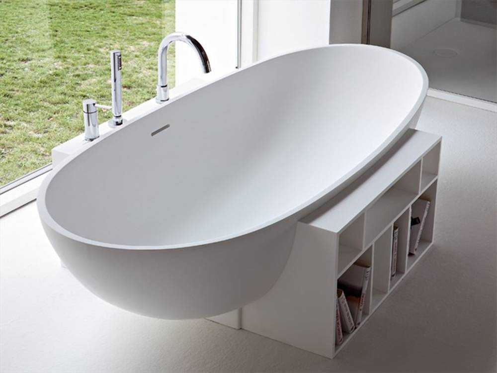 Снаружи овальная чаша бывает иной формы. Для установки потребуется специальная ниша: поставить непосредственно у стены ванну не получится.