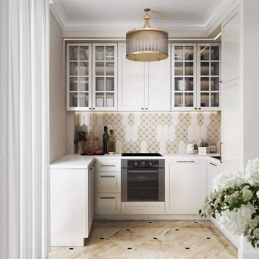 На фото крошечная кухня, где глянцевые белые шкафчики-нивидимки занимают всё межпотолочное пространство.