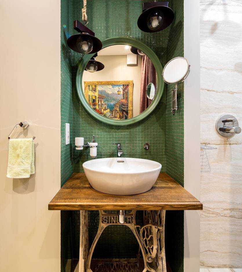 За счет этого дизайнерского шага можно сэкономить несколько квадратных метров площади, куда поместится стиральная машинка или корзина для белья