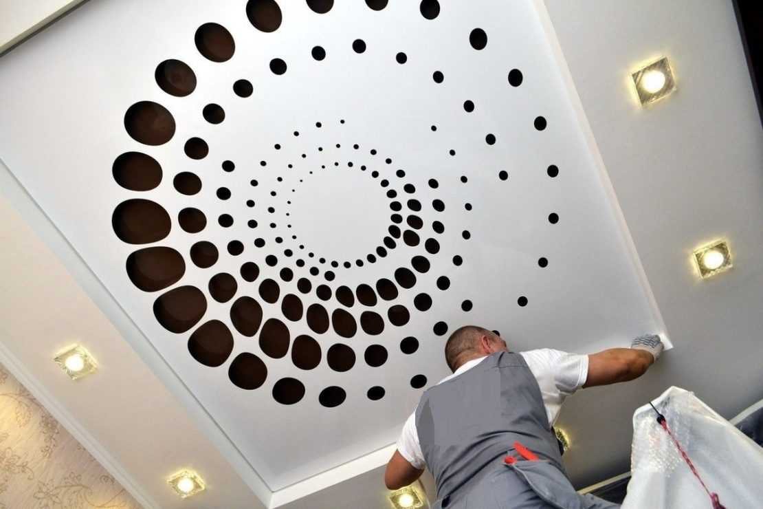 При выборе узора нужно учитывать, что круглые отверстия при натяжении могут слегка изменять свою форму.Полотна крепятся крест-накрест, начиная с угла помещения. После остывания пленки образуют ровную поверхность с декоративными вырезами.